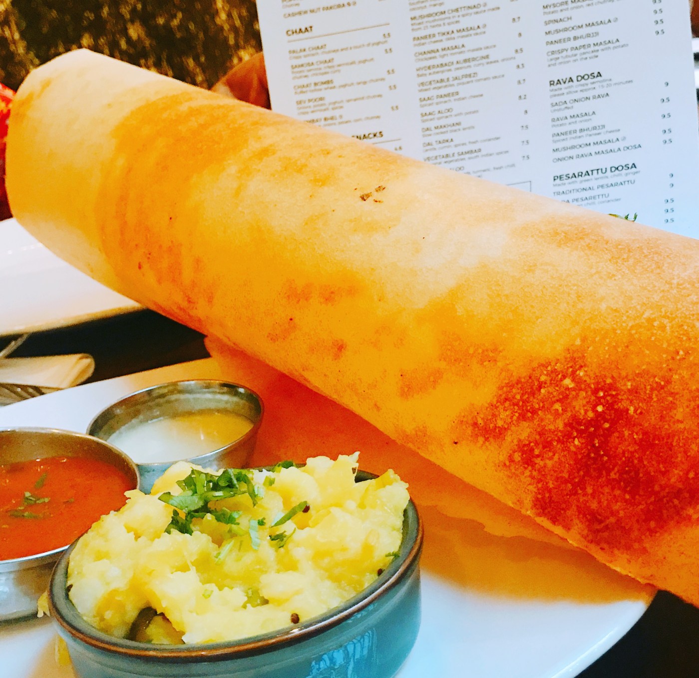 I loved the Chaas, an Indian savoury yoghurt drink with coriander, ginger, cumin and chilli. Perfectly spiced, it’s light and refreshing – the ideal accompaniment to a wholesome Indian meal. The Channa Bhatura (a spicy chickpea curry served with fluffy bread) is unmissable. My favourite, however, has to be their signature Masala Dosa (savoury crepes stuffed with spiced mashed potato, pictured above), served with the very Bangalorean Gunpowder (yes, it’s edible) to complete the Woodlands experience. Crisp, paper thin and totally delicious – a complete must do!